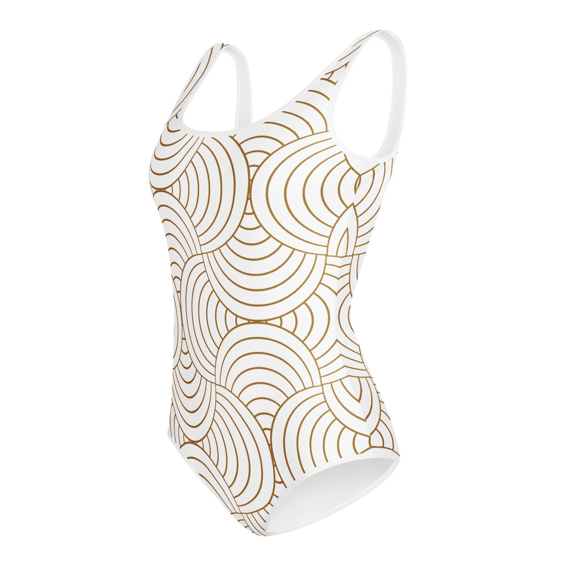 Maillot de bain une pièce pour fille ado – Blanc & Or à spirales – Confort, maintien & ligne épurée