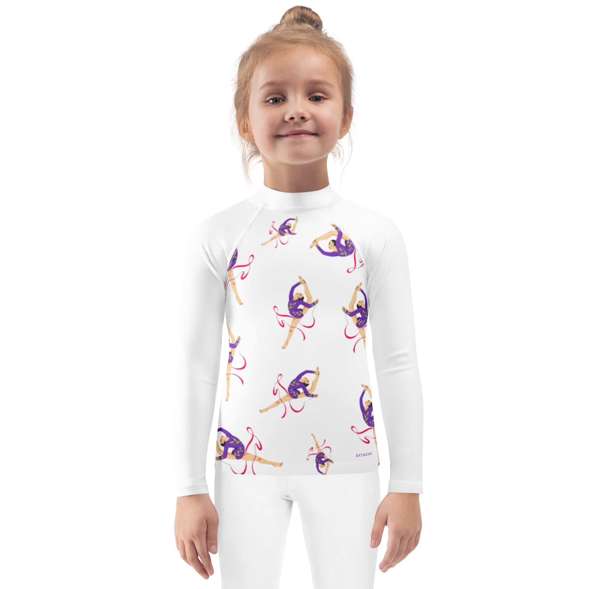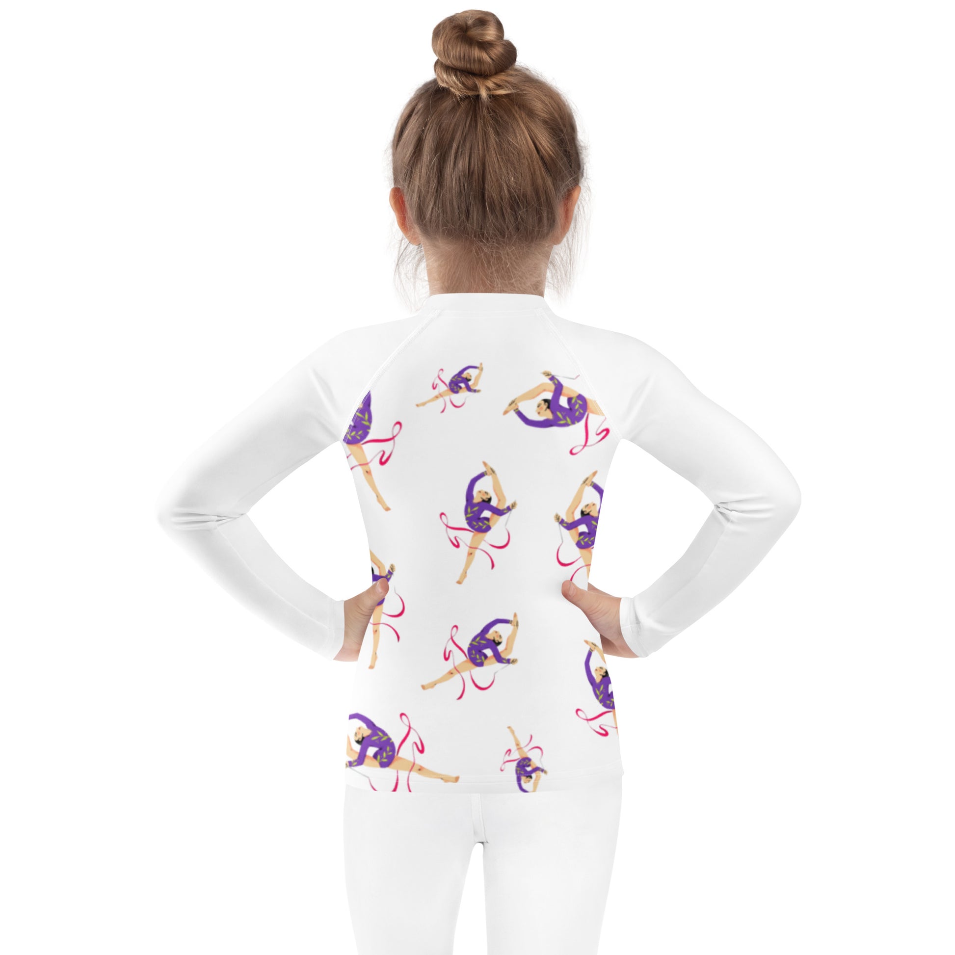 Rash guard pour petite fille – Blanc – Compression légère, séchage rapide – Motif Gymnaste Danseuse