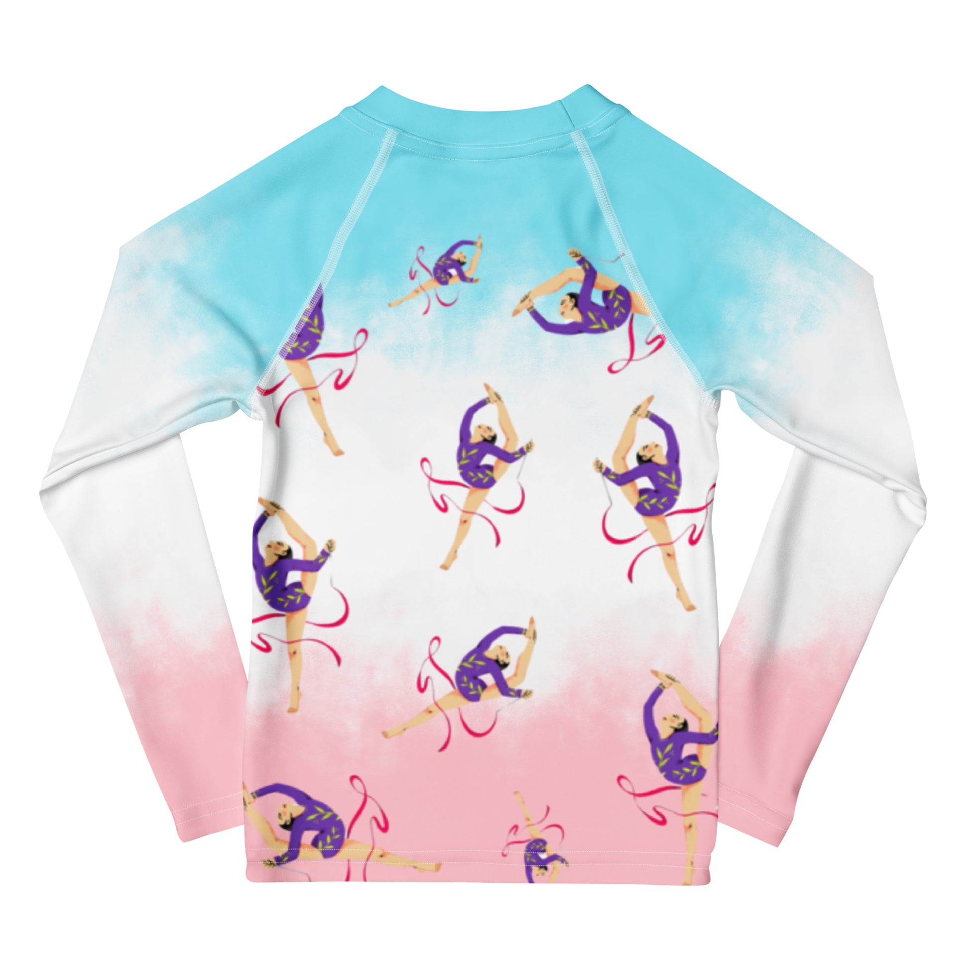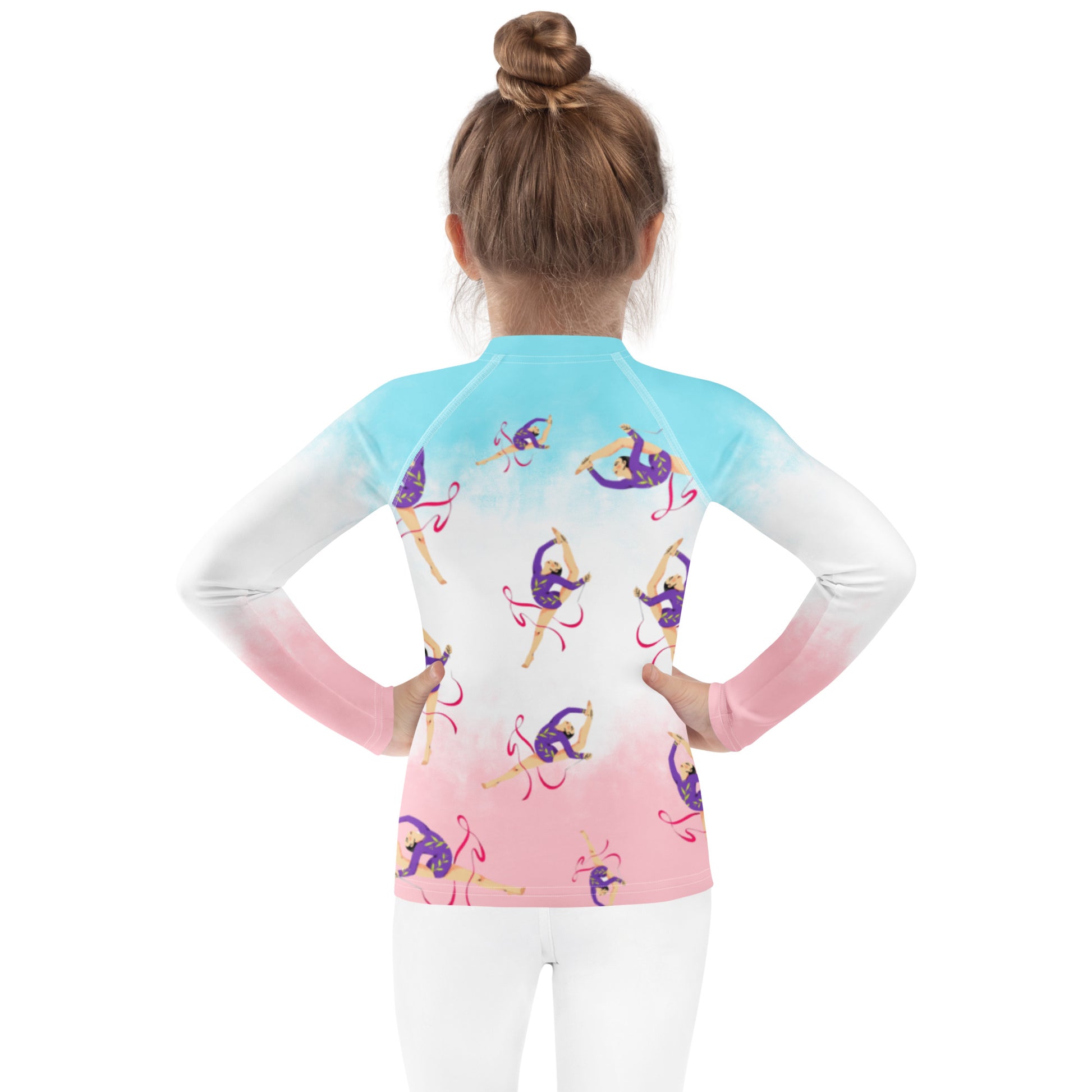 Rash guard pour petite fille – Dégradé Bleu, Blanc, Rosé – Compression légère, séchage rapide – Motif Gymnaste Danseuse